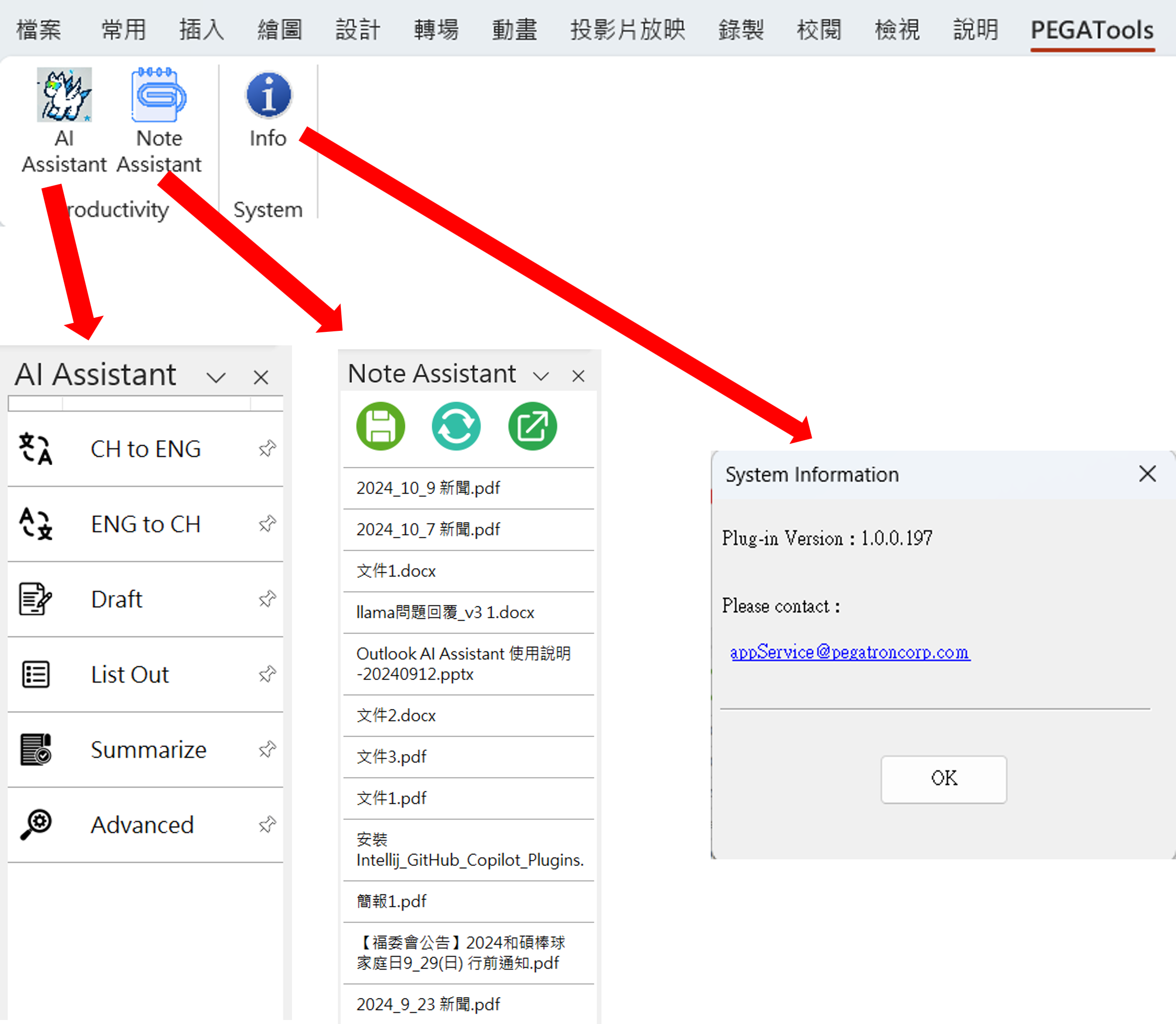 安裝完成後開啟 Powerpoint,點擊上方 PEGATools 會有 AI Assistant, Note Assistant, Info。AI Assistant 對應的是 AI 輔助工具; Note Assistant 對應的是個人文件庫; Info 則是會顯示目前的版本號。