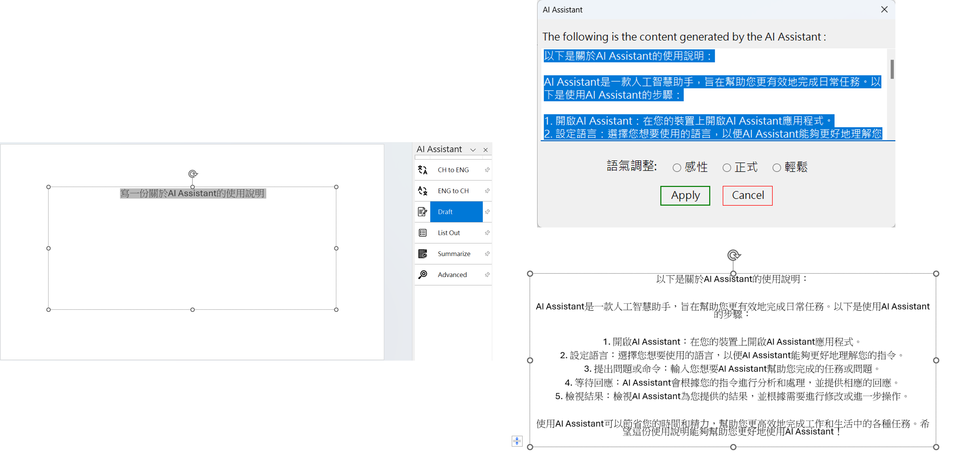 使用方式: 選取文字內容後,再點選 Assistant 中的任一功能,點選後會出現語言模型的生成結果在視窗上,使用者可以對這些結果自行修改,或選擇要調整成何種語氣(預設為無調整,此功能只能用於翻譯以及文章範本生成),並選擇 Copy(複製到剪貼簿) 或 Apply(套用),點選 Apply 後,內容會自動寫回簡報中。若無選取文字直接點選 Summarize 或 List Out,則會對所有整份郵件內容進行摘要或重點條列。