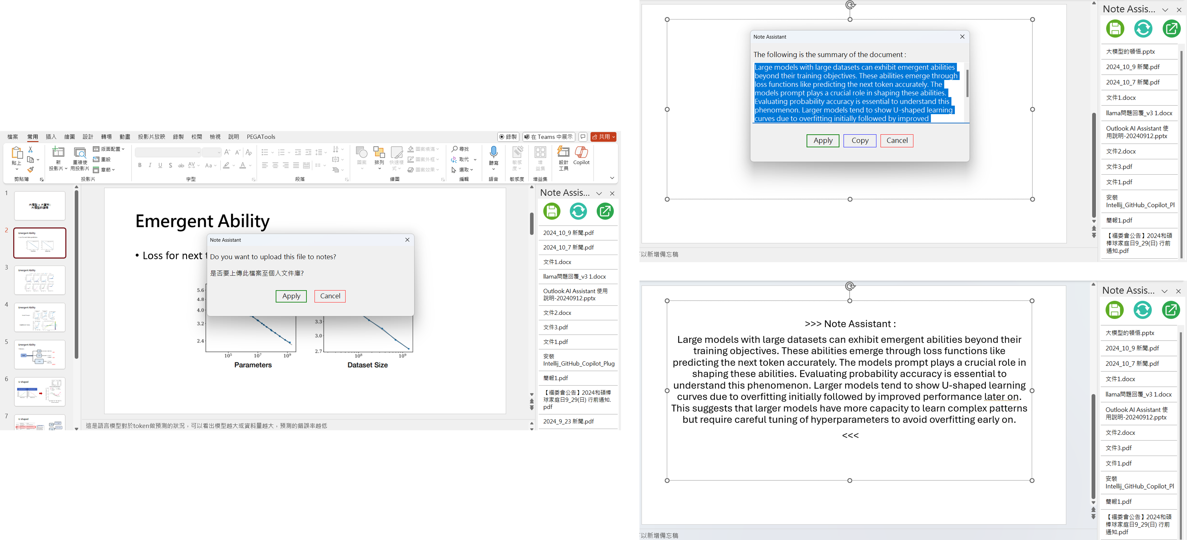 使用方式: 點選 Save this file to my notes,按下視窗的 Apply 後,便會上傳至 Note Assistant,上傳完成後,就會於右邊的列表中更新目前的上傳文件。點選列表中的文件,就會跳出有該文件內容摘要的視窗,使用者可編輯視窗中的文字,按下 Apply 便可插入至簡報中。