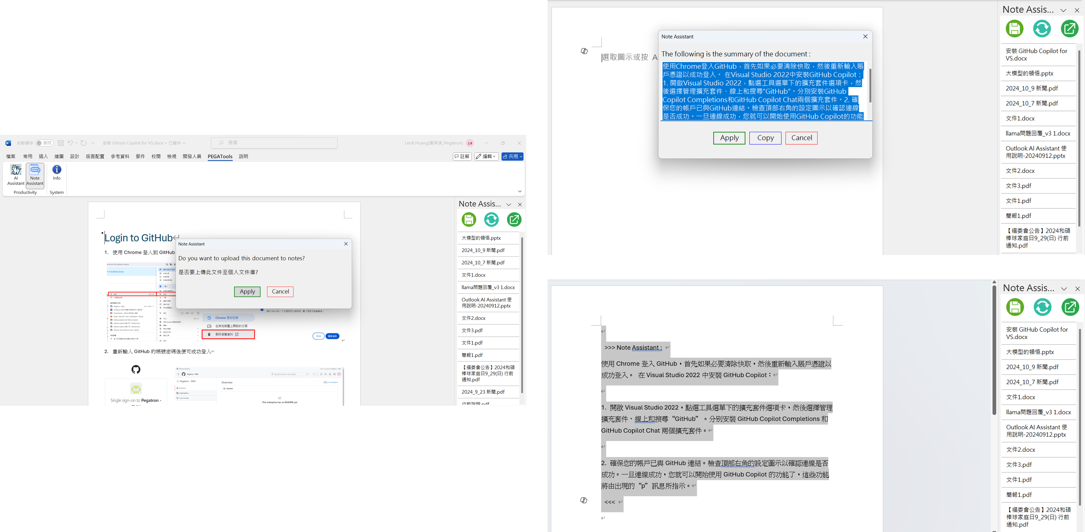 使用方式: 點選 Save this file to my notes,按下視窗的 Apply 後,便會上傳至 Note Assistant,上傳完成後,就會於右邊的列表中更新目前的上傳文件。點選列表中的文件,就會跳出有該文件內容摘要的視窗,使用者可編輯視窗中的文字,按下 Apply 便可插入至文件中。